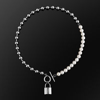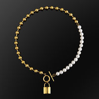 8mm 18in Women Pearl Necklace +Bead Chain with Lock Pendant White Gold/Yellow Gold